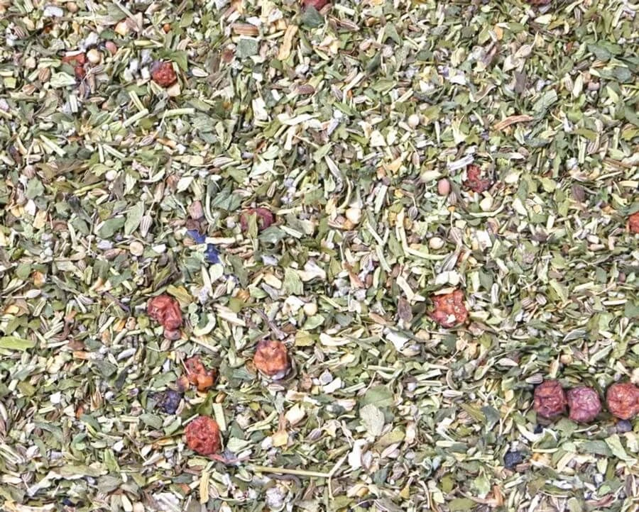 Mix d’herbes séchées (origan, menthe, herbes…) à mélanger régulièrement à mélanger régulièrement à la nourriture, une cuillère par kg.