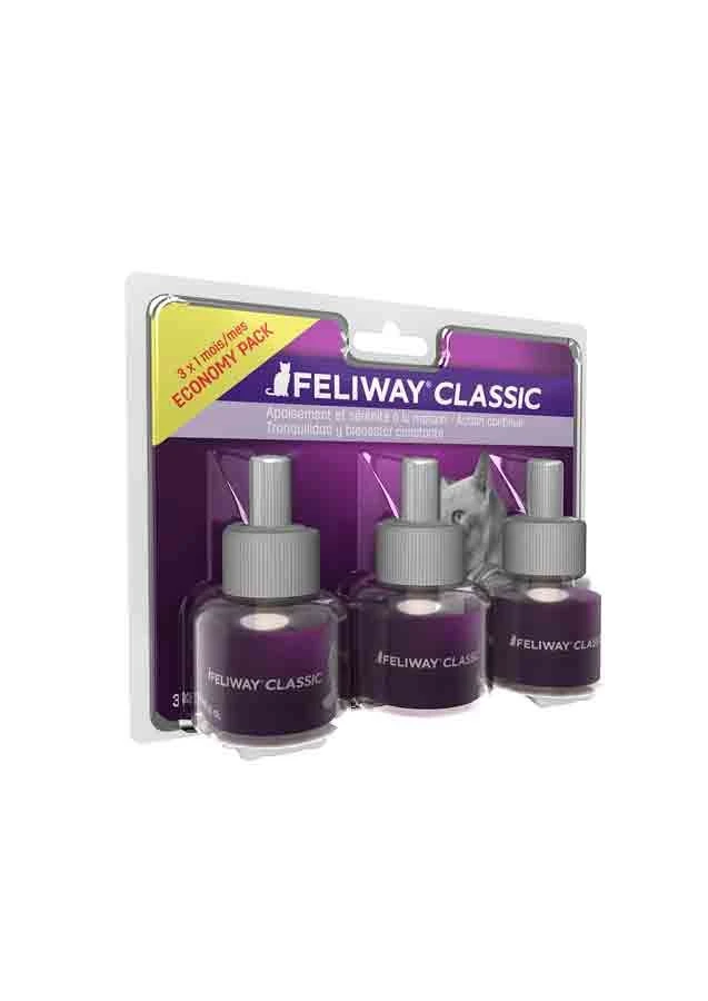 Format économique de 3 recharges pour Feliway Classic. La formule contenue dans les recharges reste la même (Reproduction synthétique de la fraction F3 de la phéromone faciale féline) et favorise ainsi le bien-être de votre chat en cas de situation de stress.