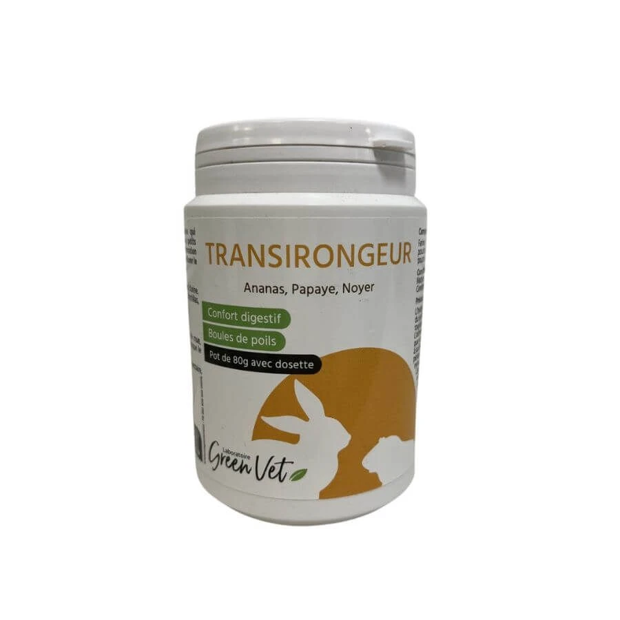 Transirongeur est un complément alimentaire qui participe au confort digestif des lapins et rongeurs, en cas de boules de poils ou de transit perturbé.
