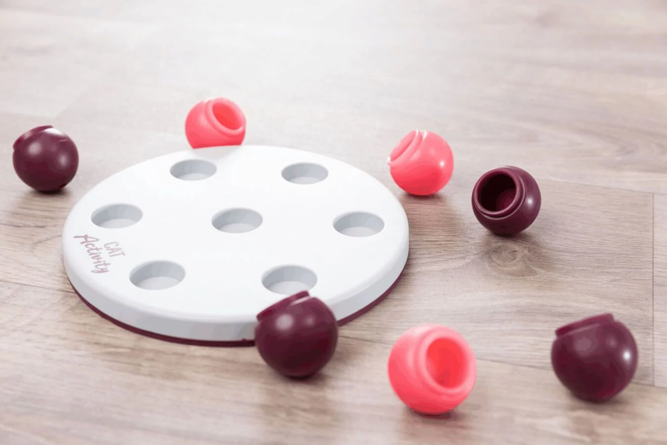 • Plateau avec 7 couvercles en forme de balle: le chat doit déplacer les couvercles pour obtenir les friandises