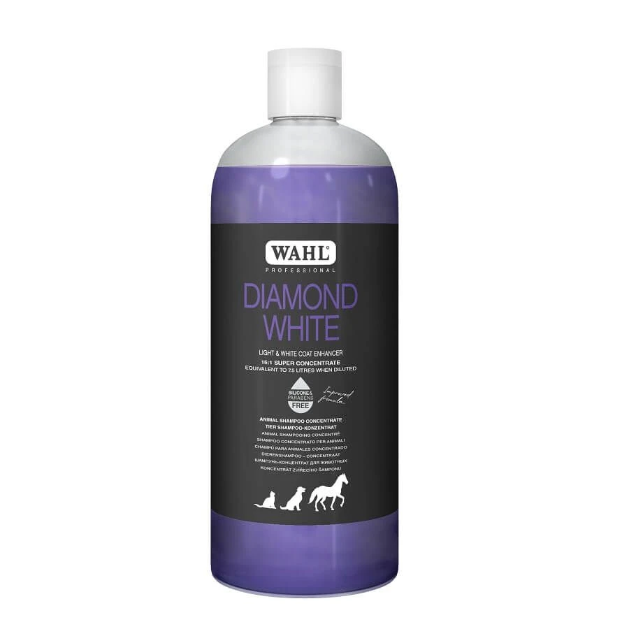 Le shampooing Diamond White de chez Wahl est un shampooing professionnel conçu pour tous les types de pelage (notamment chiens, chevaux, vaches et chats).